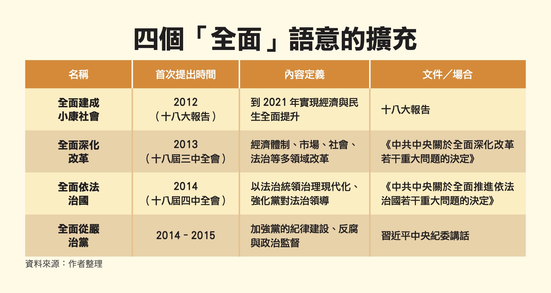 第三個維度是「國家治理」。在此層面上,「四個全面」提供了理解習式治理的政治坐標,從最基礎經濟面的全面建成小康社會開始、逐步往全面深化改革、全面依法治國、全面從嚴治黨。這四者共同構成一個從民生到權力的閉環體系:前兩者以經濟成果鞏固政權合法性,後兩者則以制度化手段擴張政治控制。