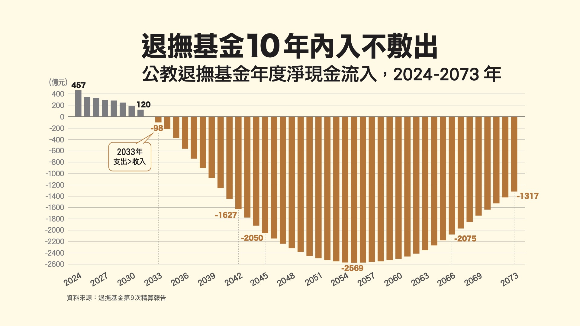 從退撫基金第9次精算報告的未來現金流量分析來看(見下圖),由於在未來10多年仍會出現退休人數持續增加、平均餘命持續延長,而且退休給付還會隨物價指數和政府調薪而增加,因此,在沒有政府撥補的設算下,公務人員與教育人員退休基金收支短差,都將在20年後各自突破1000億大關。也就是如下圖所示,2045年公教退撫基金合計當年收支短差將達2050億元。
