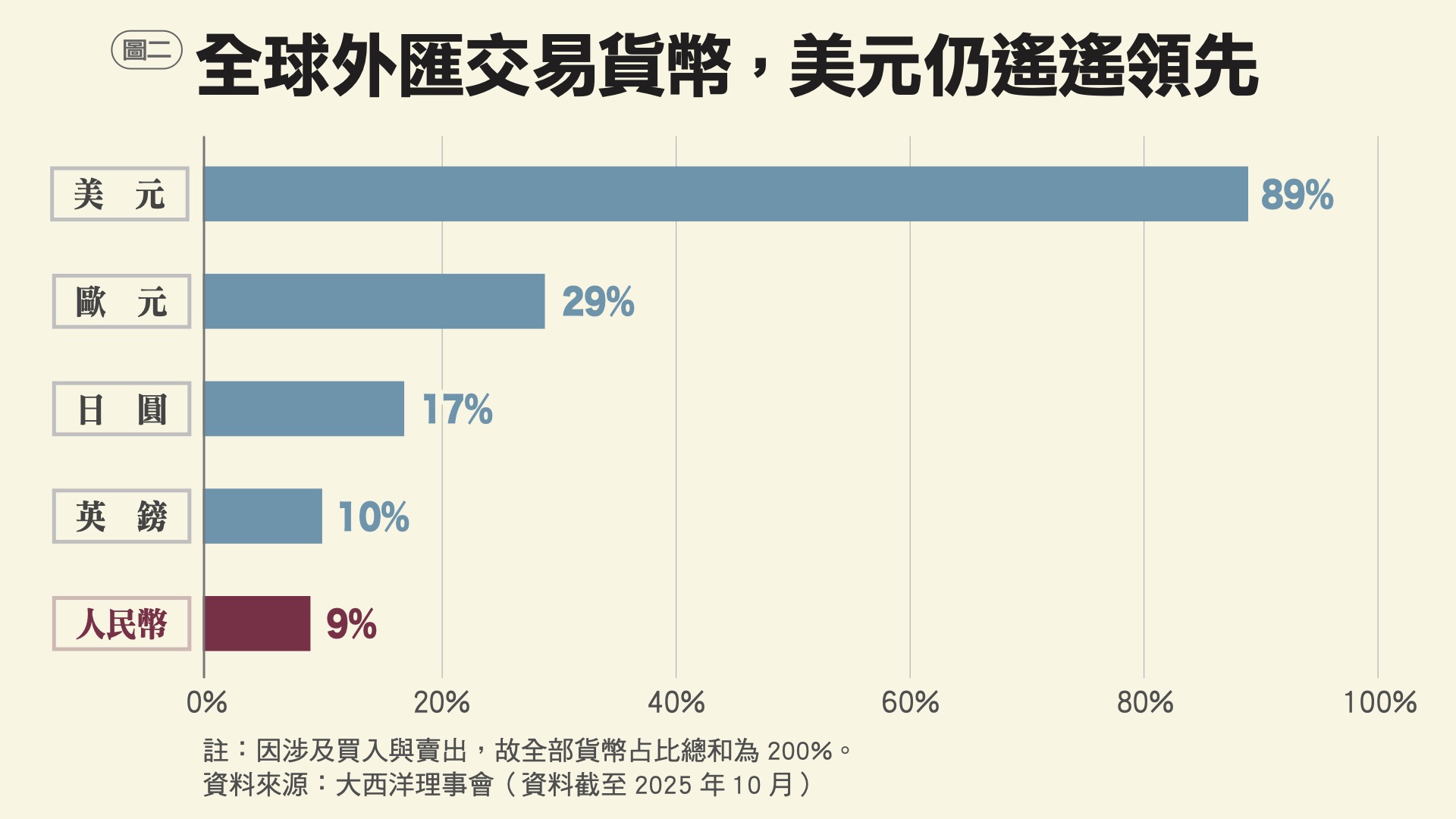 (1)交易媒介:最近數據顯示,美元仍為全球支付之首,占比逾46.7%,人民幣則排第六,占比為2.5%(見圖1)。在外匯交易中,美元占比更高達89%(見圖2,因涉及買入與賣出,全部貨幣總和為200%),人民幣只占9%。值得注意的是,中國與一帶一路及金磚國家成員國之間,有部分以人民幣結算的跨境支付是透過「人民幣跨境支付系統」(CIPS)進行,在 2022年以後快速上升,可能未完全反映在國際通用的環球銀行金融電信協會(SWIFT)數據中,因此即便部分經由的CIPS的金流仍須依賴SWIFT的訊息傳輸管道,仍可能低估了人民幣的實際使用量。