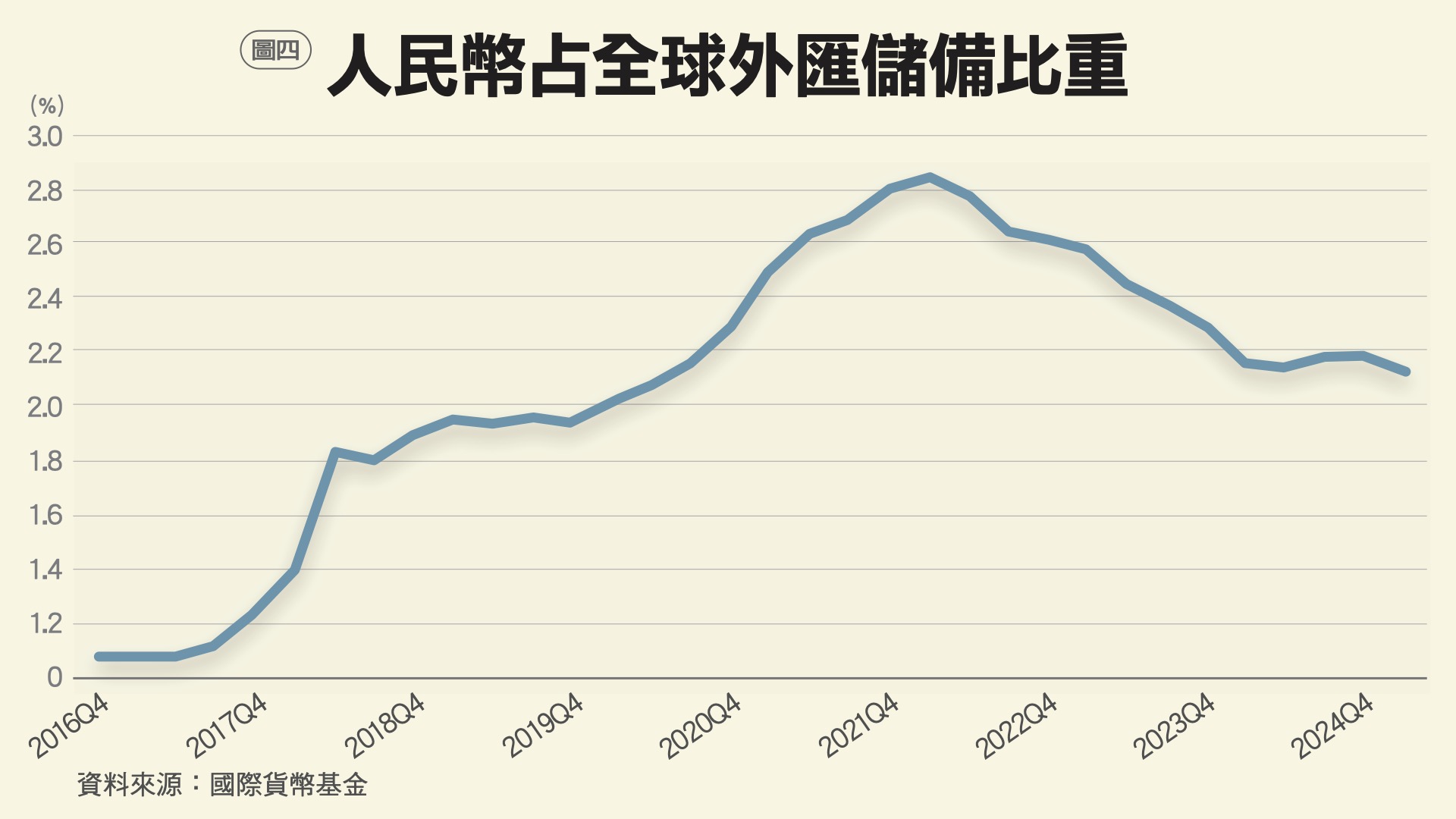 在2015年人民幣納入IMF特別提款權(SDR)後,各國央行外匯儲備中的人民幣比重穩定上升,於2022年第一季達到最高點2.8%;然而之後就回落,至2025年第一季已降至2.1%,如圖4所示。值得注意的是,俄羅斯與捷克等央行已逐步出售持有的人民幣資產,反映國際市場對人民幣作為價值儲藏貨幣的信任仍不足。