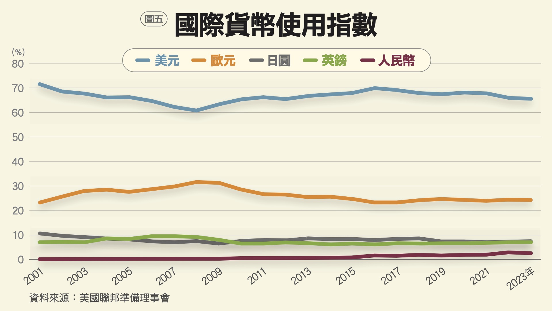 另一方面,Serkan Arslanalp等學者及Menzie D. Chinn等學者,分別對主要五種儲備貨幣(美元、歐元、日圓、英鎊和人民幣)進行研究後發現,國際儲備貨幣地位的高低決定於下列幾項重要因素:(1)經濟規模與貿易規模: GDP 占比;(2)金融市場規模、深度、流動性與開放度: 外匯交易量;(3)對貨幣價值的信心或可信度: 通膨差異、相對 SDR 貨幣籃的匯率貶值、匯率波動度;(4)網絡外部性或慣性: 外匯儲備貨幣占比的落後項。這些因素確實反映過去以來這5種儲備貨幣,在各國央行所持有作為外匯儲備的比重,如圖3所示。