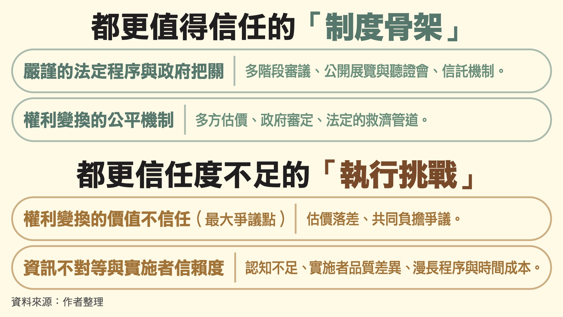 都更與危老能否順利推展,最關鍵的因素是讓所有參與者安心與放心,也才可以有效抑制貪心。制度面臨的關鍵缺口如此明確,政府應該用更為積極、高規格的態度,加速修定法案以強化專業信任環境。都更與危老專業服務業的法制化與正式化(可訂立專法或分別在都更條例與危老條例中補充),讓老舊社區民眾有可以依靠的專業服務者,也讓市場上許多優質服務團隊可以累積品牌價值,同時讓推動老屋重建所需的資金獲得金融機構融通,並有效降低金融機構的資金放貸風險,最終的目標,是讓都更與危老變得簡單可信,所有的案件都可以順利完工交屋。在這樣的機制運作下,地方政府的都更審議,也應該提供更具體明確的審查項目、標準與時程,才能獲得民眾與業者的信任。