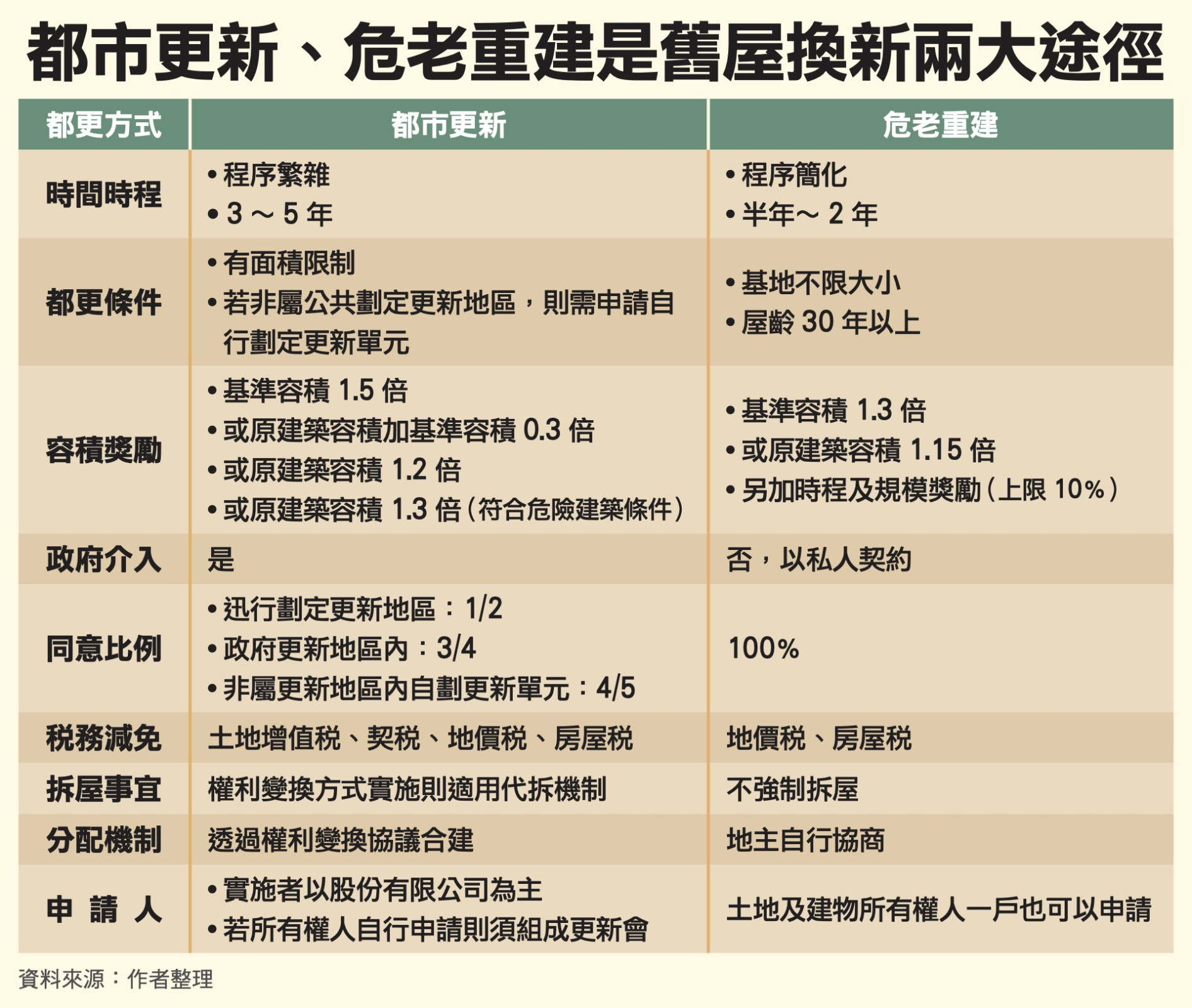 台灣老舊房子很多,以2025年第二季資料觀察,全國925萬戶住宅存量,其中屋齡超過30年有554萬戶,超過40年也有300萬戶以上。老屋新生主要透過都市更新和「危老重建」(危險及老舊建築物加速重建)兩個管道,蔡英文總統任內推動的都更三法,讓過往難以推動的更新改建工作有了明顯進展,至2025年10月底全國都更新案一共核定了1270案,危老重建也超過4600案,擺脫10年前「都更已死」的困境。然而,各界期待有更多成果,甚至抱怨都更、危老仍舊推動困難。