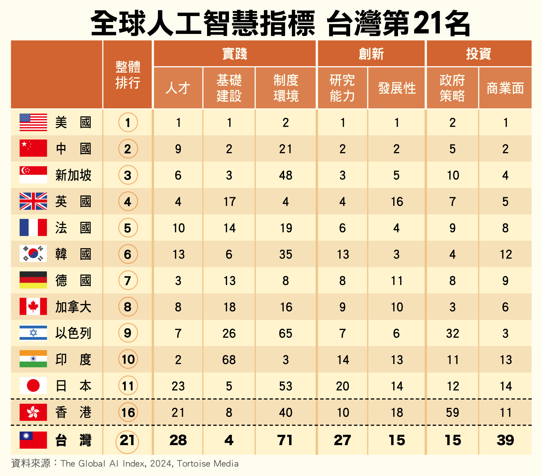 根據2024年9月的第五版最新GAII,全球AI能力最強的前3名依序是美國、中國與新加坡,亞洲的韓國排第6、印度第10、日本第11、香港第16,台灣雖然這兩年股市因AI大漲,但其實排名僅列第21名。