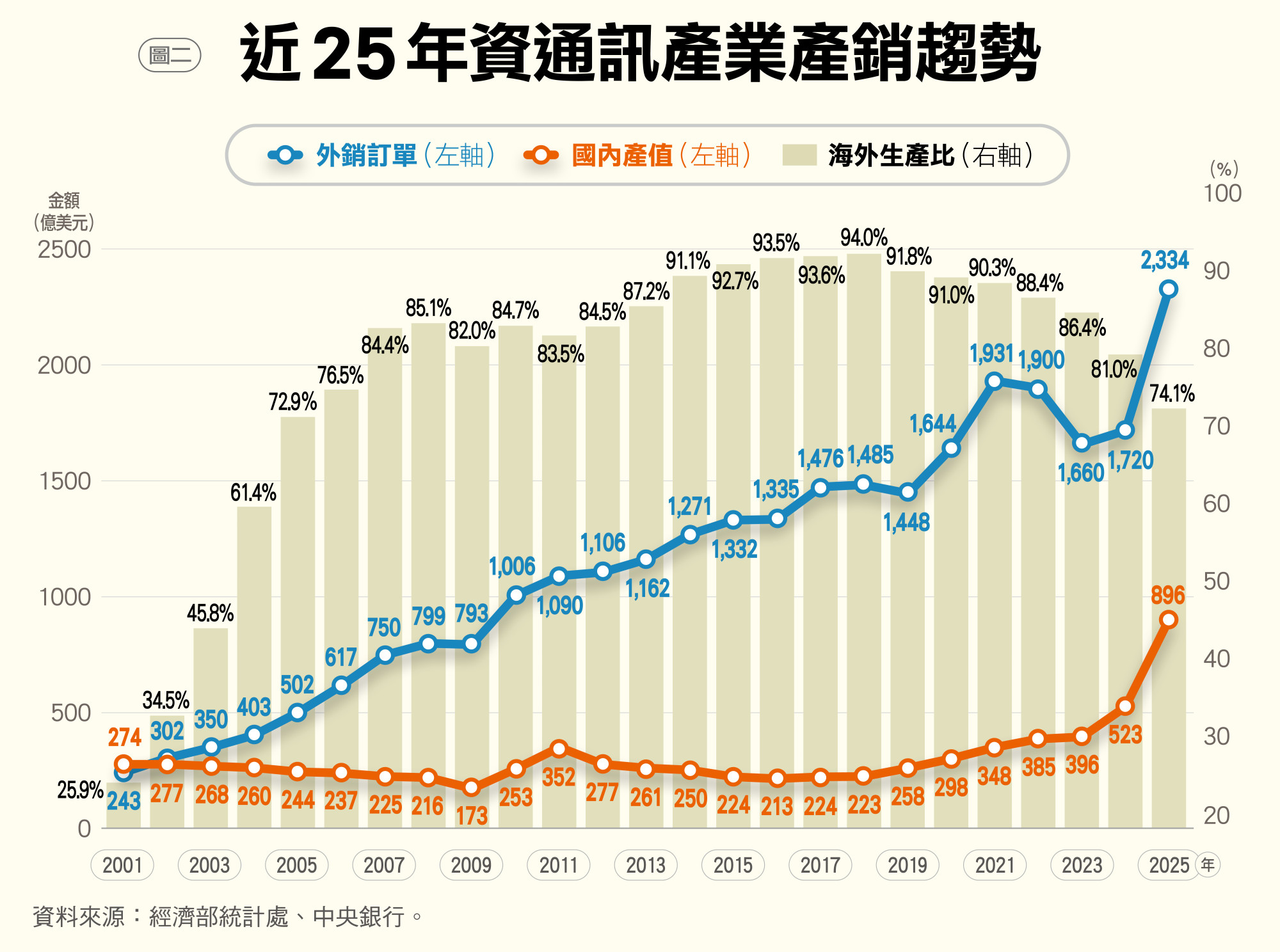 圖二可觀察台灣資通訊產業從2001年迄今的外銷訂單與國內產值變化趨勢。直至2018年為止,國內生產均僅維持在250億美元以下的水準,但從2019年起,資通訊產品的國內產值開始逐步攀升,2021年突破300億美元,2025年一舉衝高至896億美元。至於外銷訂單,則從2001年起幾乎呈現穩定斜率上升,兩者之間的差異,呈現在不斷攀高的海外生產比重數據上。