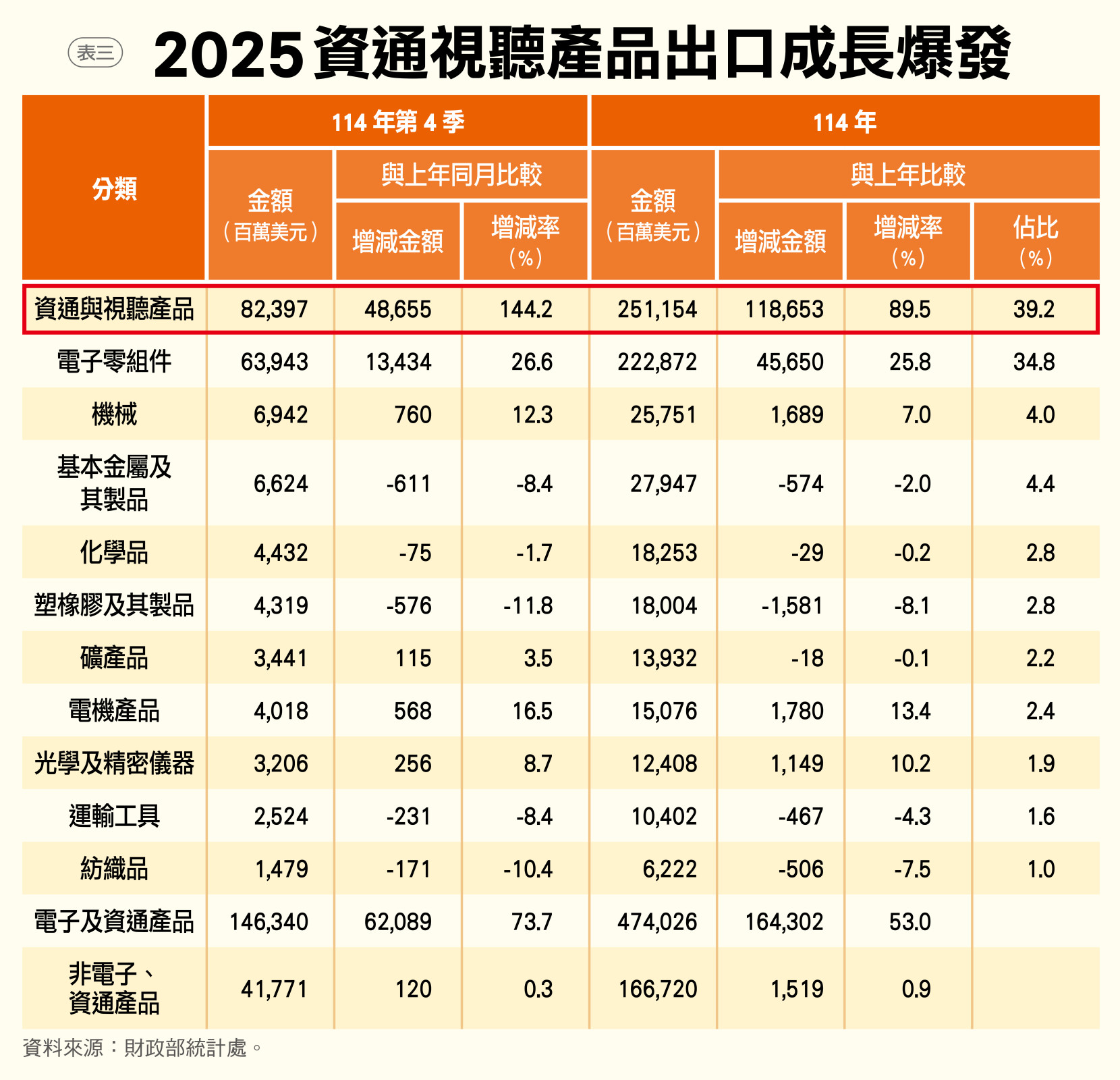 根據財政部統計處的分析,細部觀察各項資通訊產品出口表現,可以發現2025年資通訊產品總出口額2512億美元當中,主要是「電腦及其附屬產品」(出口1834.82億美元,年增率117%)以及「電腦之零附件」(出口291.82億美元,年增率103%)帶動,不過不僅資訊硬體產品,包括手機、交換器、路由器、手機及網通產品之零組件等網通類產品亦有相當不錯的表現。