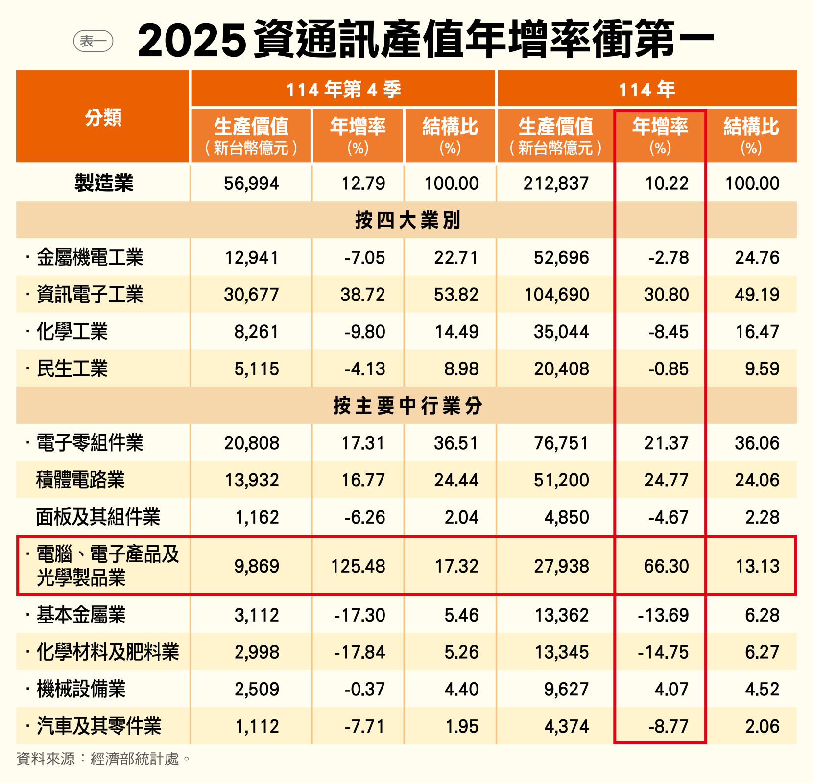 2025年,台灣資通訊產業繳出一張極為亮眼的成績單。表一至表三呈現台灣資通訊產業之產值、外銷訂單與出口數據。如表一所示,2025年整體製造業產值年增率10.22%,但四大業別中,除了佔產值近5成的資訊電子工業成長30.8%之外,其餘金屬機電、化學、民生等工業均呈現衰退。