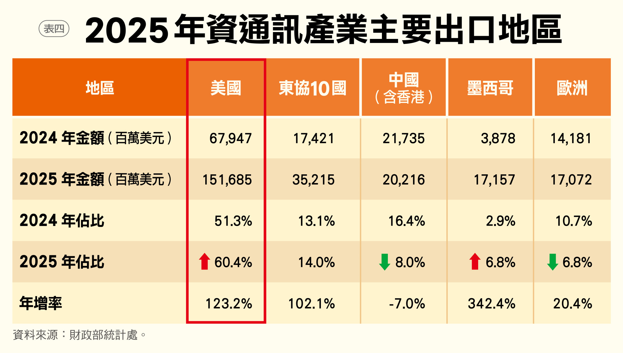 此外,從表四可見,台灣資通訊產品前五大出口地區(合計占96%)依序為美國(60.4%)、東協10國(14%)、中國含香港(8%)、墨西哥以及歐洲。其中對美出口年增率高達123.2%,出口占比則從2024年的5成左右一舉站上2025年的6成,輸出東協與墨西哥的金額與比重亦見明顯增加;出口金額與出口占比雙雙衰退的則僅有中港,至於歐洲市場雖仍溫和成長,但占比相較美、墨大幅成長而下滑,反映美國市場一頭熱現象。