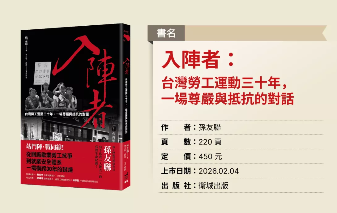 這本書名為《入陣者》。「入陣」,既是參與勞陣與社運的歷程,也是面對生命的一種姿態。它不是孤身向前的壯舉,而是與無數入陣者、助陣者並肩同行的過程。在推動勞動與社會政策的路上,我看見夥伴在攻防中堅持、在挫敗時相擁,也在微小的勝利裡沉靜而真實地喜悅。那些片刻,構成了我人生最深刻的風景。