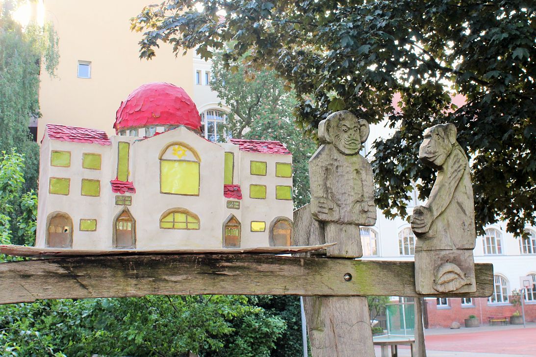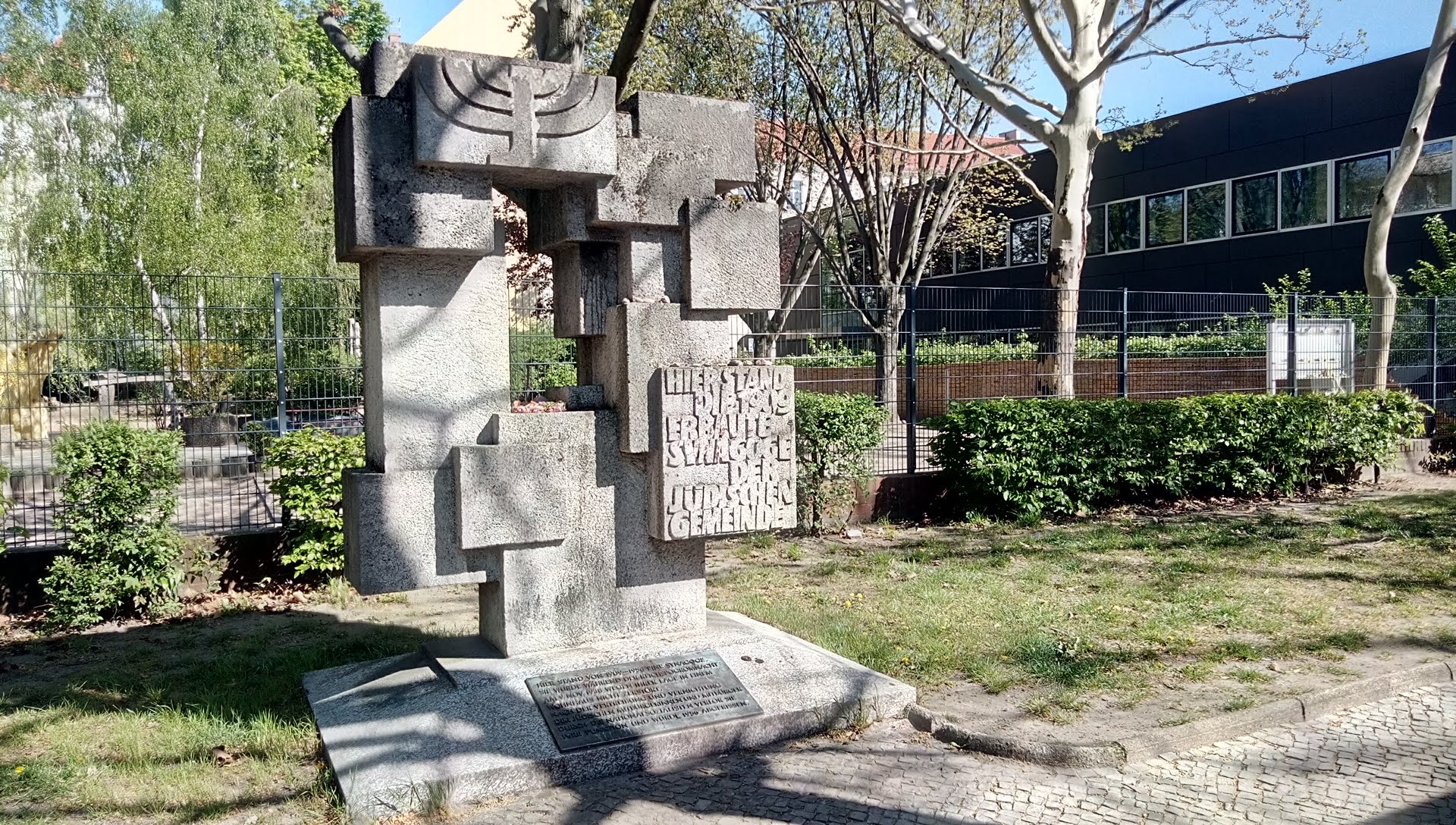 1909年,當時的猶太籍居民蓋了一棟猶太會堂。納粹政府上台後,對猶太籍德國人進行一連串迫害,許多人消失在集中營,或是被迫拋下一切逃離德國。這個教徒心靈寄託的地點在納粹時期經歷大量的搶劫和破壞,戰後被拆除,現已不復見。猶太會堂的遺址上有所學校,原來就是我在巷口中經過的略克尼茲小學。小學操場的籬笆外、人行道邊立了一塊紀念碑,敘述著這段歷史。