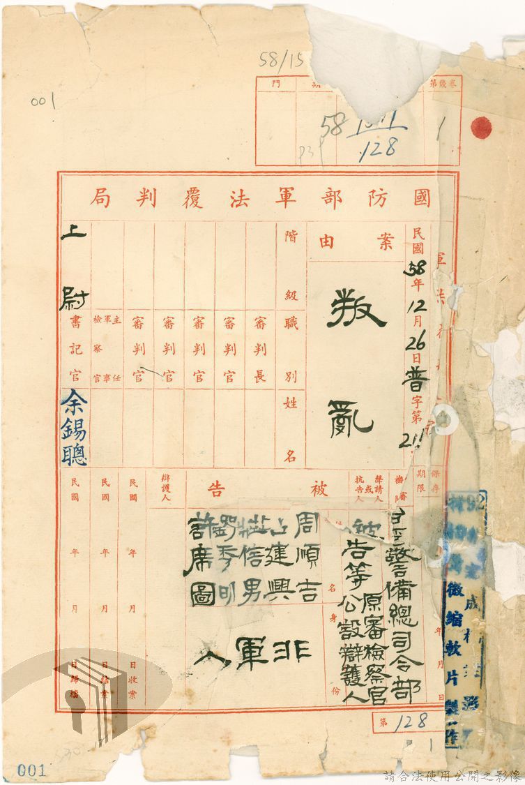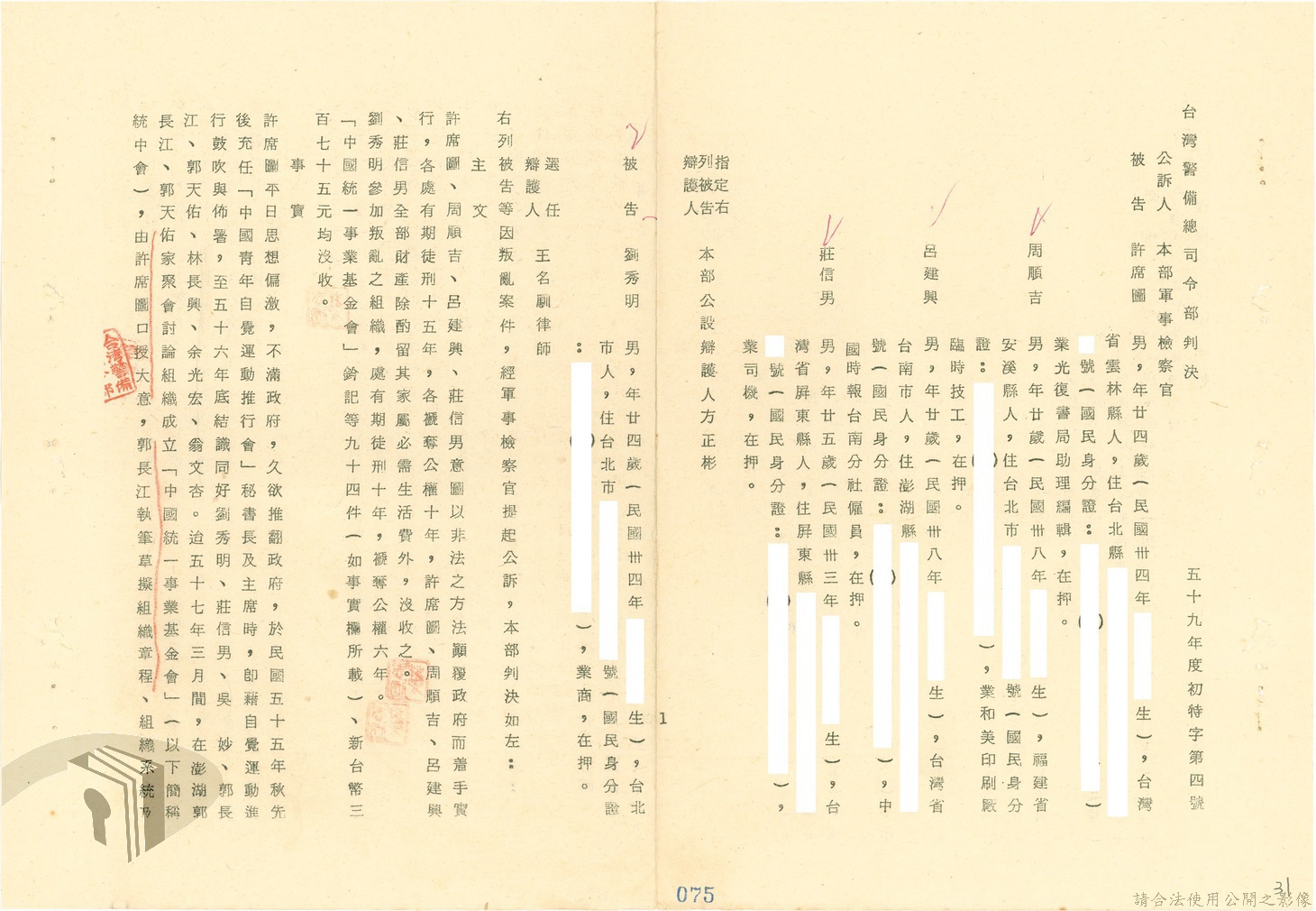 判決書隔了兩個月才送達他們及律師手上,此時,除了許席圖的精神失常症狀更趨嚴重,由律師提出「不利益聲請覆判」要求醫療鑑定之外,其他四人都向國防部聲請覆判,國防部於1970年3月發回更審;結果,1971年4月3日,警備總部軍法處竟然加重判刑,原判十年改判十五年,原判十五年改判為無期徒刑。