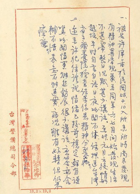 「此等叛亂罪,不論年幼(齡)如何,凡其已至十八歲者應依法取(懲)治,至許席圖主犯不論其是否精神分裂症,既係主犯,不得停審,應判處死刑,餘照甲案辦理,勿延 中正」。