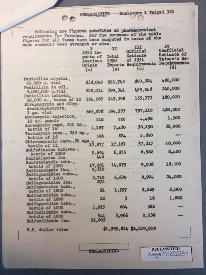 「眾所周知,(台灣)軍方正在出售某些藥物...國民政府為防止將藥品轉運到大陸所建立的出口管制措施大部分是順著美國的意思去做的。...但是,國民政府當局進行的實際最終用途檢查顯然很少而且敷衍了事。他們沒有真正的興趣阻止藥物進入大陸。」