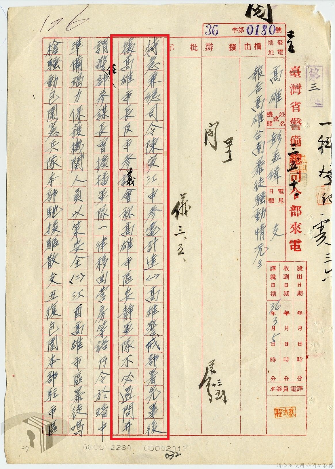 謎團之二。該電文還說,「暴徒集於本部哨兵處,經捕捉數名並手槍一支,刻正嚴訊中」,陳述情節類似大家熟知發生在3月6日的情景,當時上山談判的代表中有三位當場遭逮捕:范滄榕、曾豐明、凃光明,還有彭孟緝所謂的凃光明一把手槍被扣留。這就產生了疑點: