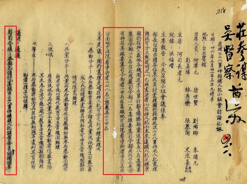在槍決凃光明等三人及相隔半個月的林界之後,彭孟緝才在三月底頒行「高雄市二二八事件嫌疑人犯調查委員會組織綱要」,由警備總部3月31日召開的「處理二二八事件拘捕人犯小組會議」(檔案管理局檔號:A305550000C=0036=9999=2=1=025=0001)追認通過。該項會議決議,高雄市因情形特殊可照該綱要辦理,即:(一)審查已經逮捕之人犯;(二)由高雄要塞司令部聘請當地法院推事或檢察官與該部軍法官組織會審審判,其他各地因情形不同,可不必援用。可見當時完全是非法審判或沒有所謂的審判。