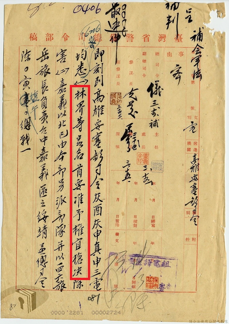 另外,檢視台灣省警備總司令部的人犯名冊所載,特別重要的有兩點:一為「委任代核」,一為「糾正核准」。意思是說,警總接受委託代為審核或核准,由於是屬於先斬後奏的案件,違反上級規定的程序,因此,予以行文或口頭糾正後勉予核准。可見彭孟緝擅自獨斷便宜行事的作風,後來的林界冤死案雖然有事先報備,仍依照個人主觀好惡「權宜槍決」的。