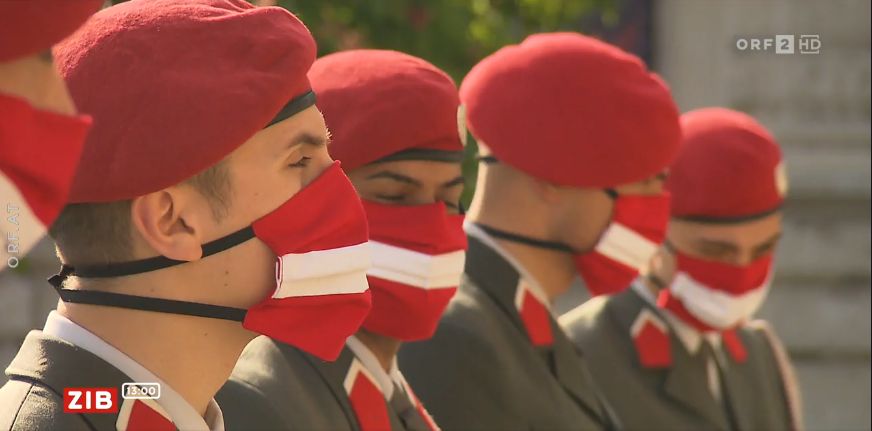 每年的4月27號,奧地利都會大幅慶祝奧地利民主史上重要的里程碑。為因應新冠病毒疫情,今年徹底縮小慶祝規模:軍樂隊只派出一名小號手作為代表,而聯邦軍衛隊的阿兵哥在低調的慶祝儀式上,皆戴上奧地利國旗圖案的口罩。 政府官員也通通戴上口罩參加小型慶祝儀式。
