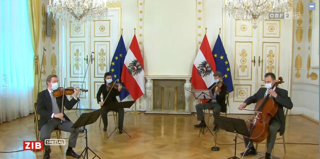 奧地利著名的維也納愛樂樂團派出旗下弦樂四重奏,在沒有任何來賓的總理府裡,演奏國歌,為響應防疫和做好社交距離,他們皆戴上口罩,座位之間也都距離好幾公尺(一般而言,弦樂四重奏是緊密坐在一起的)。
