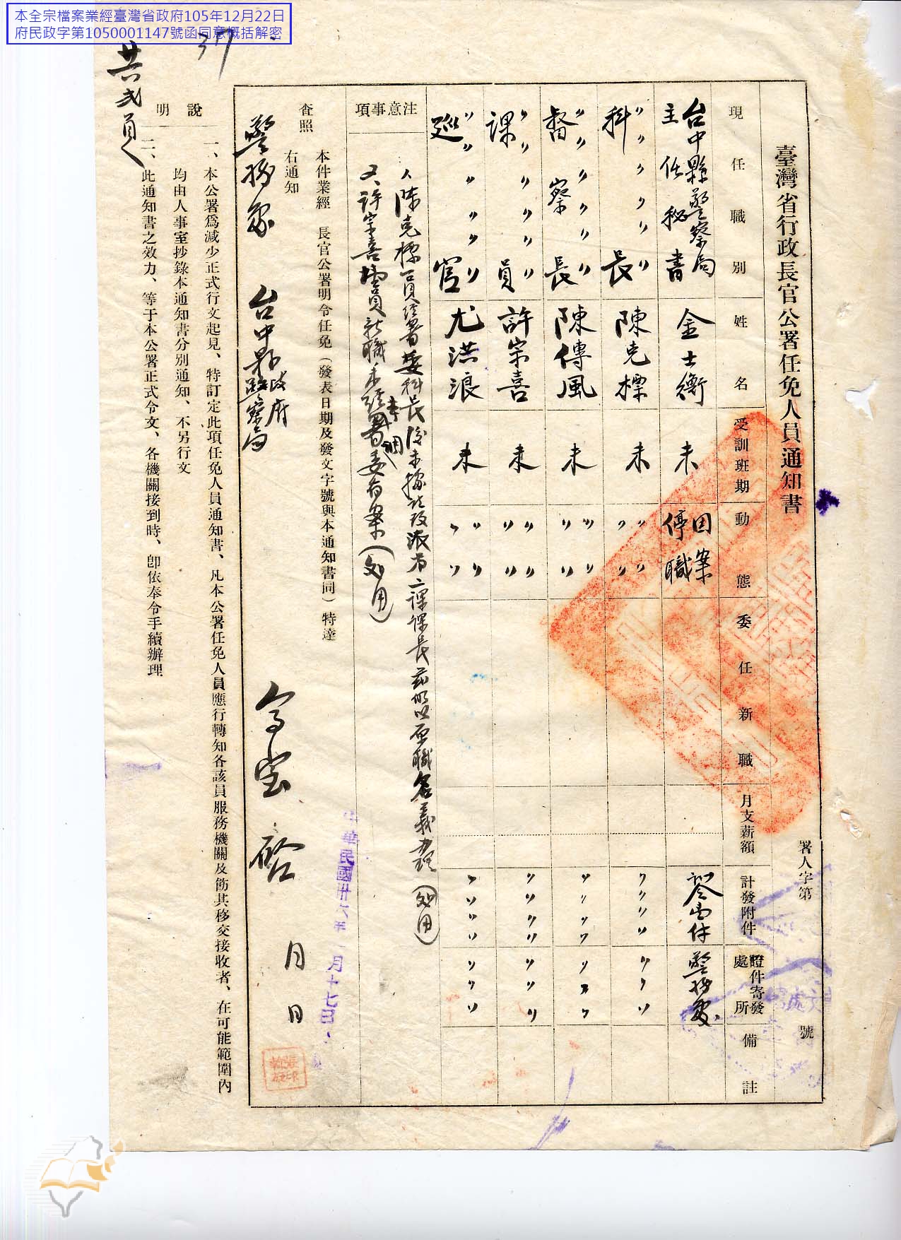 金士衡由台中縣警察局主任秘書先派代彰化市警察局秘書,後來又調任為台中縣警察局第五科科長。許宗喜復職仍任原職,同年六月底與另兩名警察藉公招搖,未奉命令擅自查封民谷,嗣後以該民谷未構成囤積居奇,又擅自予以啟封,經查雖無索詐實據,遭調任彰化市警察局科員,八月卻以父亡母病需人照顧請辭回福建,九月原擬將他免職,十月竟厚待他准予辭職。