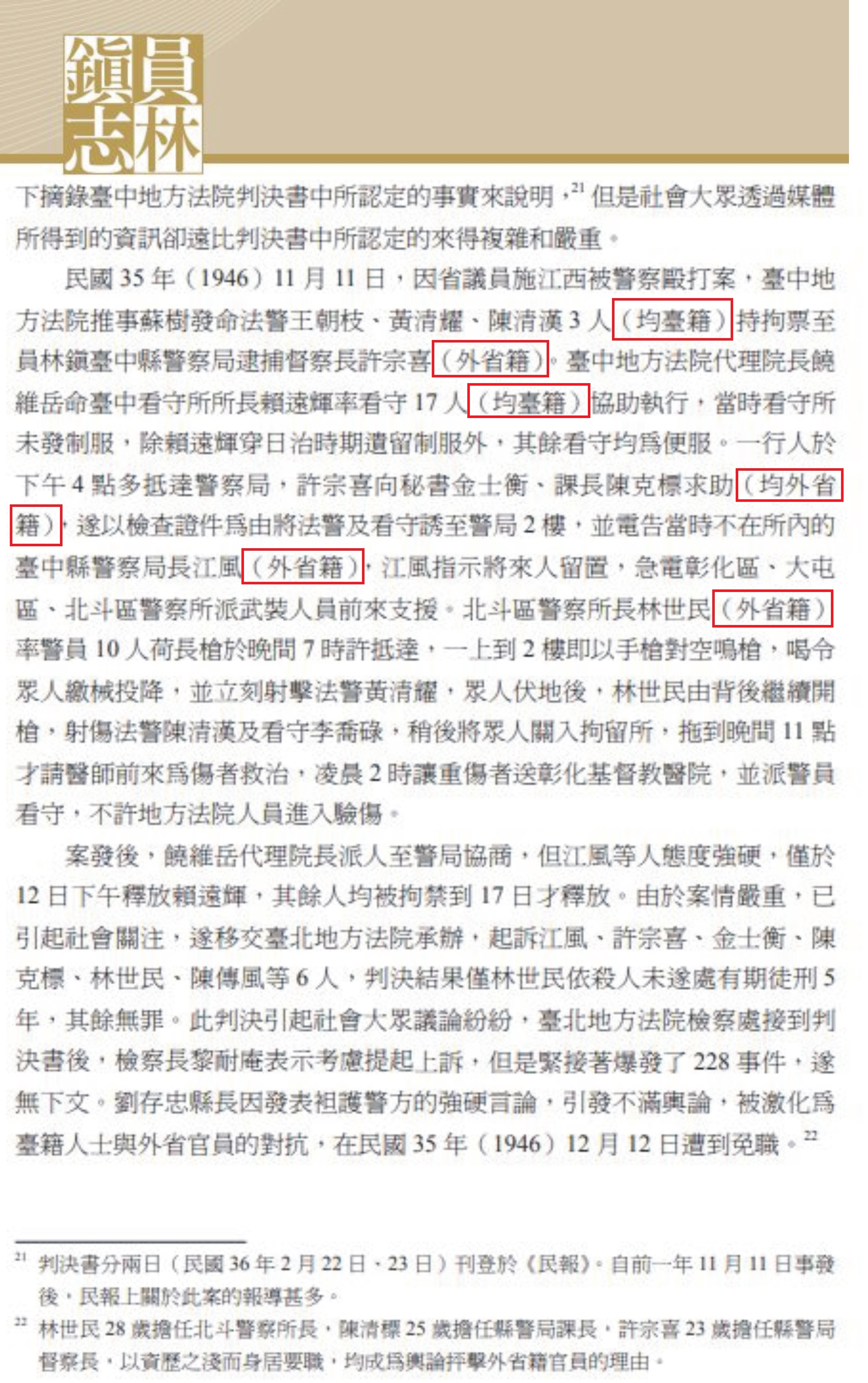 員林血案因為涉及省籍,是外省殖民族裔 VS.本省被殖民族裔,《員林鎮志》寫到員林血案時,對相關人員都特別以引號標示「外省籍」、「台籍」,其意涵也許盡在不言中吧。