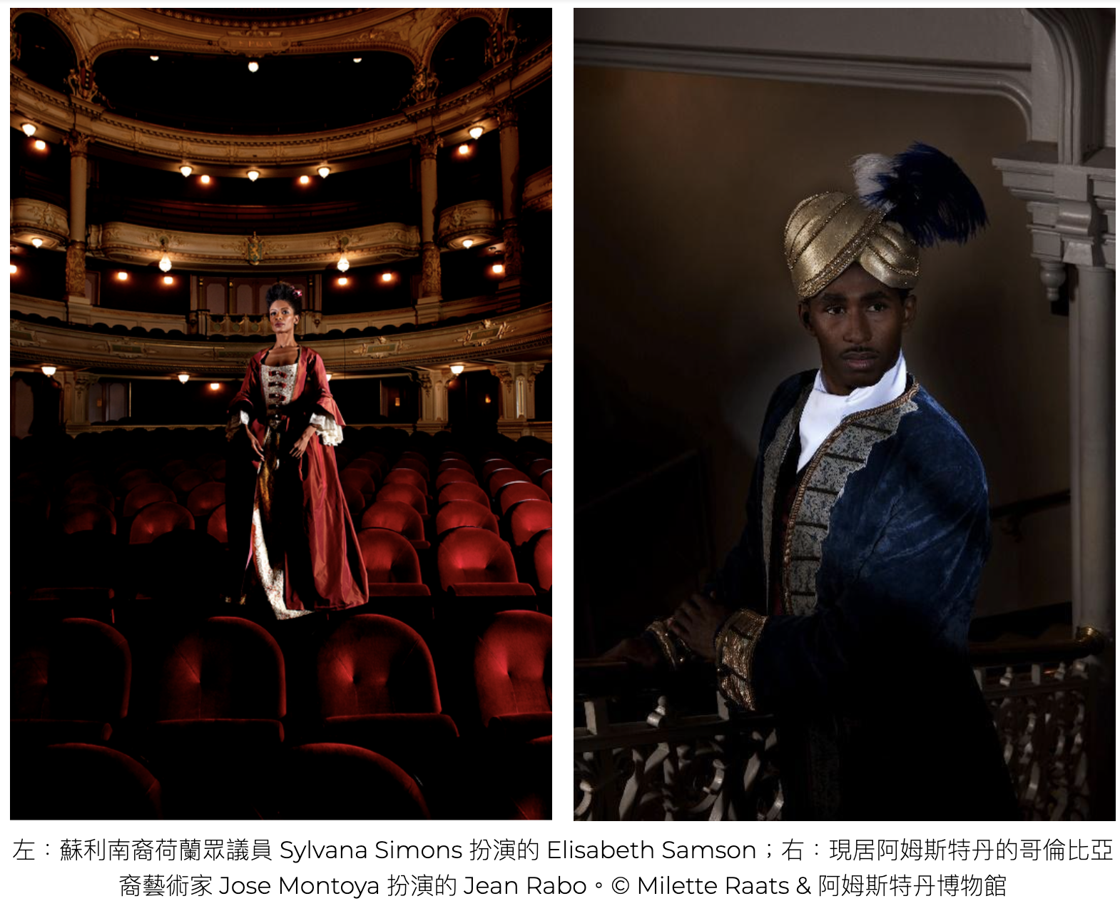 有鑑於此,該展邀請了具有非裔或南美背景的荷蘭住民,扮演 13 位被歷史忽略的十七、八世紀人物――例如成功經營咖啡豆生意的蘇利南女商人 Elisabeth Samon、或奧蘭至親王威廉四式(Willem IV, Prins van Oranje,當初受贈 Hansken 的省督的表孫)的男僕 Jean Rabo――讓攝影師藉由當代的繽紛,重新呈現更貼近當個世代的吉光片羽。這 13 幅攝影肖像完成後,被放進改名為「十七世紀群像」(Groepsportretten van de 17e Eeuw)的阿姆斯特丹隱士廬博物館展廳中央,直視牆上原有的權貴階級。
