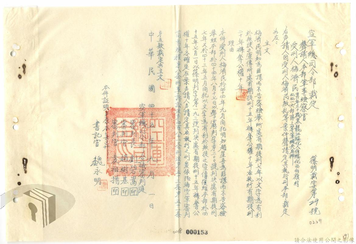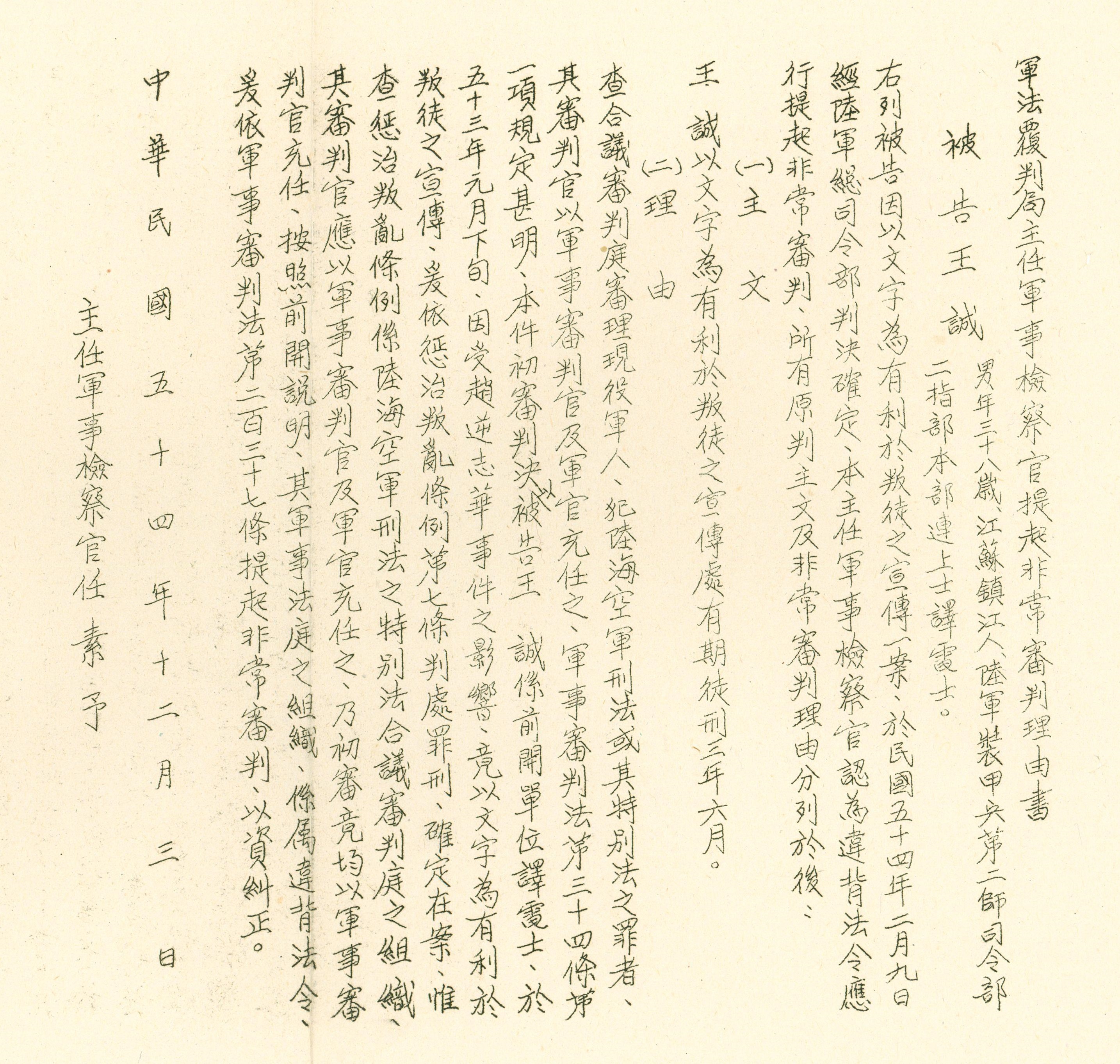 第二師司令部軍法處不採信他的辯解,依〈懲治叛亂條例〉及〈軍事審判法〉,扣上「以文字為有利於叛徒之宣傳」、「以文書公然侮辱上官(係指他侮辱陳誠)」等罪名,判處有期徒刑三年六月(陸軍裝甲兵第二師司令部,〈五四〉審字○○七號),結果,這項判決卻違背了審判程序的法令。