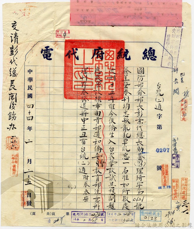 軍法處未採信他的辯解,認定他「連續以文字為有利於叛徒之宣傳」,一九五四年十月二十日判決有期徒刑十五年,聲請覆審遭駁回,同年十二月裁定維持原判一審定讞。判決文報呈到總統府,蔣介石除准予備查之外,還批示:「今後僑生入台求學考試,思想問題應嚴密考核,希由貴部(筆者註:國防部)通知僑委會、教育部注意辦理。」(總統府代電台統〈二〉適字第○二○七號)
