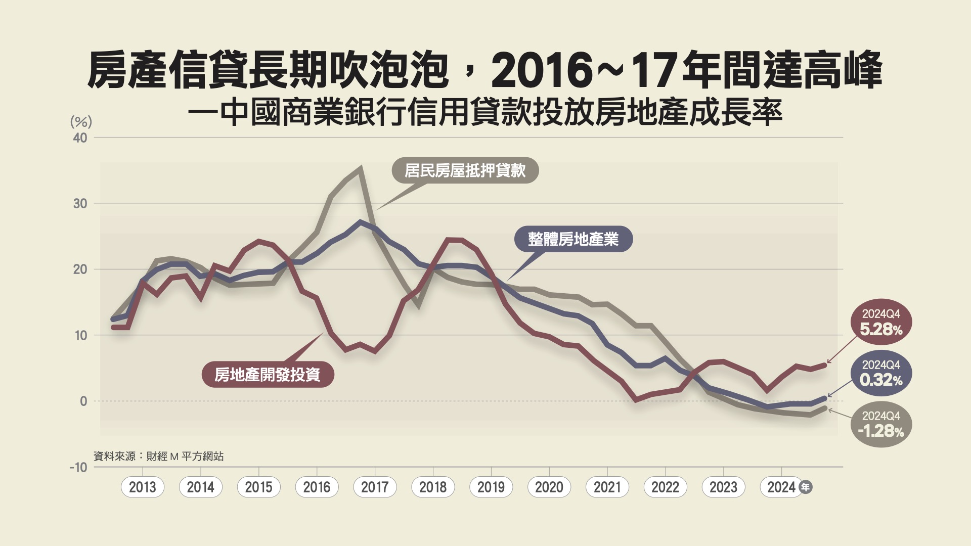 銀行資產膨脹的最主要來源是中國經濟成長所帶來的存款增加,以及對房地產的長期信貸支持,後者不單單指購房貸款(中國稱為按揭貸款),也包括建設貸款、開發貸款與地方政府土地融資平台所主導的各種基建信貸工具。在房價上漲的時期,這些業務不僅安全,還極具盈利性。抵押品價值高、違約率低、風險權重計提相對保守,讓銀行得以在帳面上不斷擴張資產與收益。