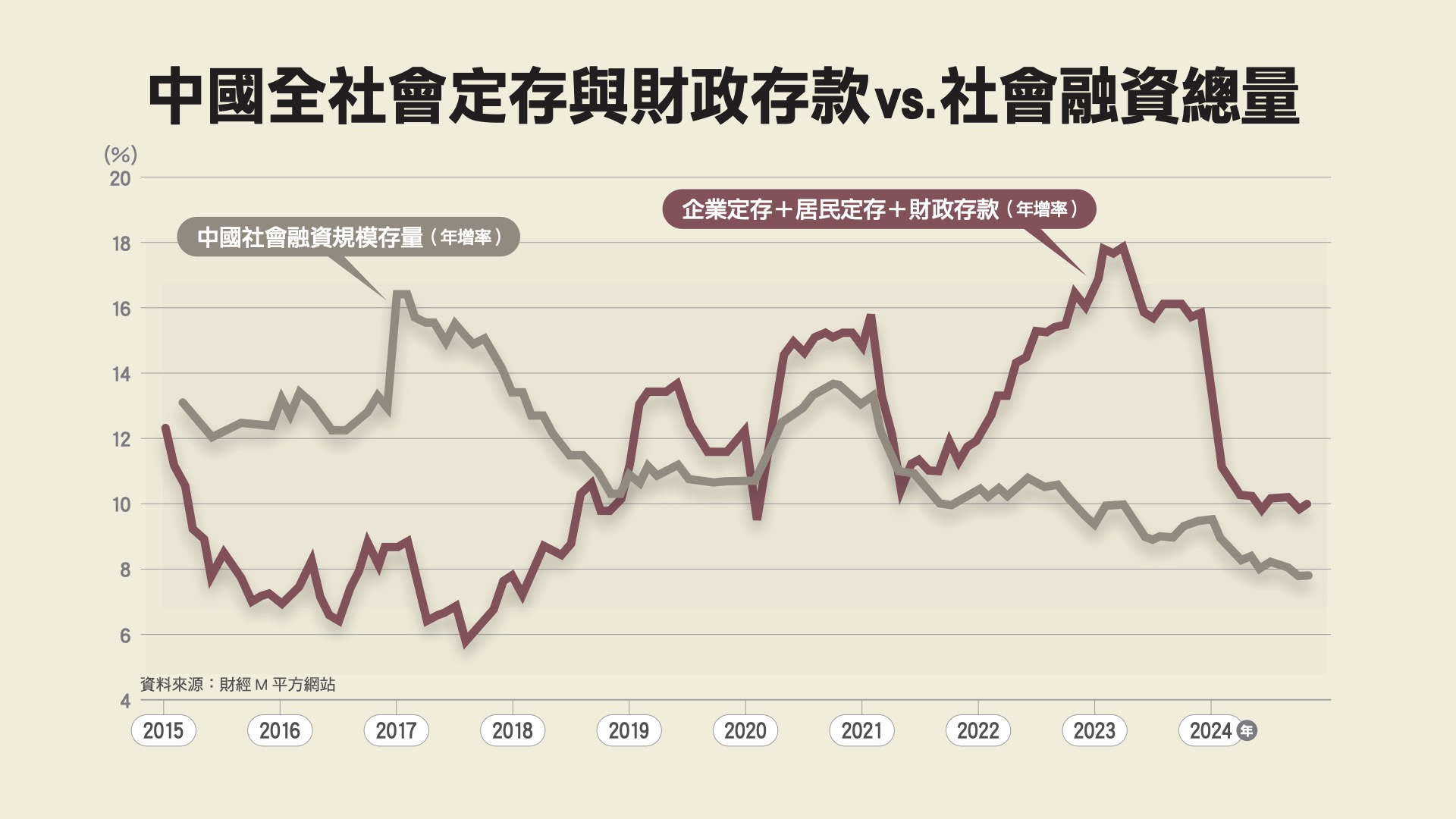 中國銀行業的資金成長主要來自存款的增加,而存款成長速度與經濟環境密切相關。隨著經濟增速下滑、失業率上升,這兩年來,企業與居民存款成長已經開始減緩,影響銀行的資金流動性。(見下圖)