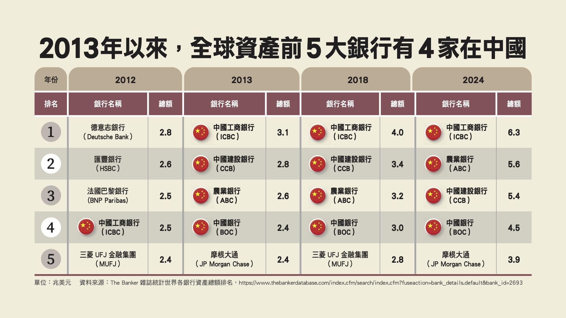 中國金融體系在過去幾十年經歷了驚人的擴張,其總資產規模已成為全球金融版圖中的重要力量。自2012年以來,中國的四大國有銀行(中國工商銀行、建設銀行、農業銀行及中國銀行)長期穩居全球銀行資產規模前列,且資產總額更是持續增加。(見下表)