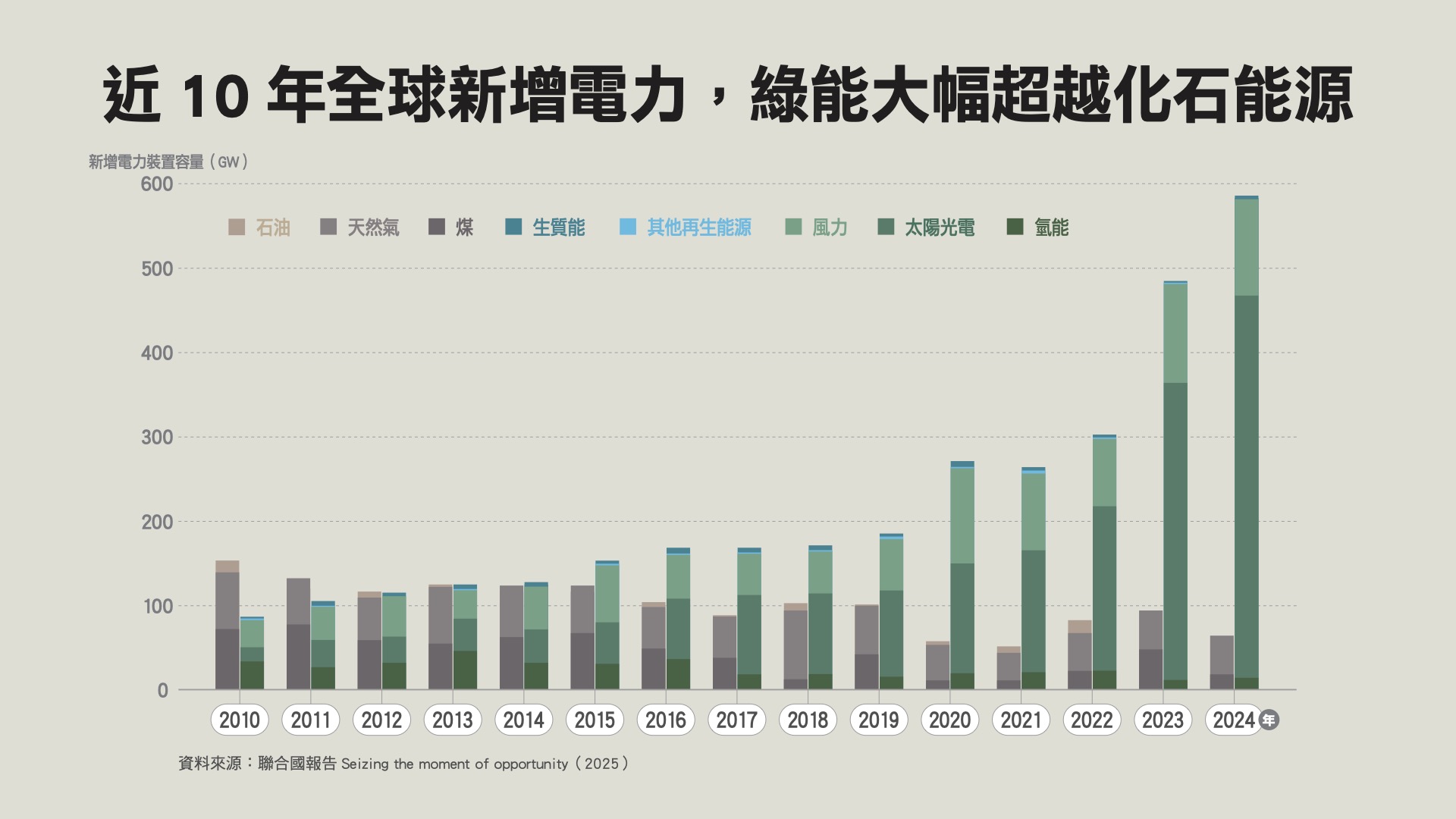 該報告指出,2024年再生能源占全球所有新增電力裝置容量的92.5%,佔發電成長量的74%。古特瑞斯特別強調,邁向再生能源的未來,已經不是願景及承諾,而是正在發生的事實與趨勢。他也呼籲所有科技公司承諾,在2030年使用百分之百的再生能源為所屬資料中心供電。
