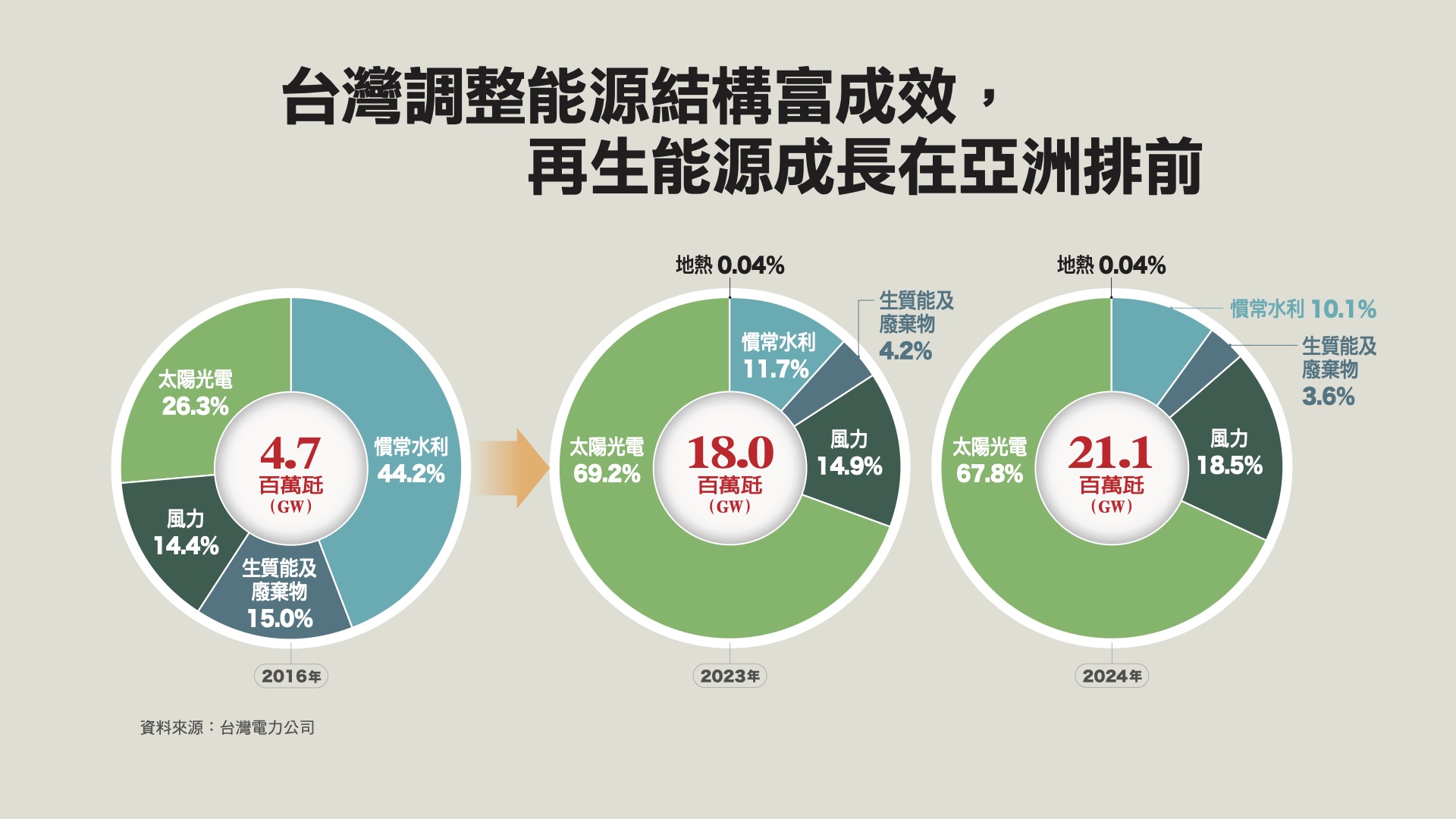台灣從2016年以來,以創能、儲能、節能智慧系統整合為核心的能源轉型,已經逐步在調整能源結構方面取得相當的成效。短短八年間,我們從幾乎仰賴進口化石燃料的島嶼,達到風力與太陽光電裝置容量增加超過五倍的成果。根據國際再生能源總署(IRENA)的統計資料,台灣再生能源成長速度在亞洲名列前茅;資誠聯合會計事務所發表的「2024全球與台灣電力暨再生能源市場報告」指出,台灣的能源政策與國際趨勢一致,逐步減少燃煤發電,並增加再生能源的使用。2024年燃煤發電佔比已降至39%,低於燃氣佔比42%。同時,核能佔比僅4%,而有12%來自再生能源。