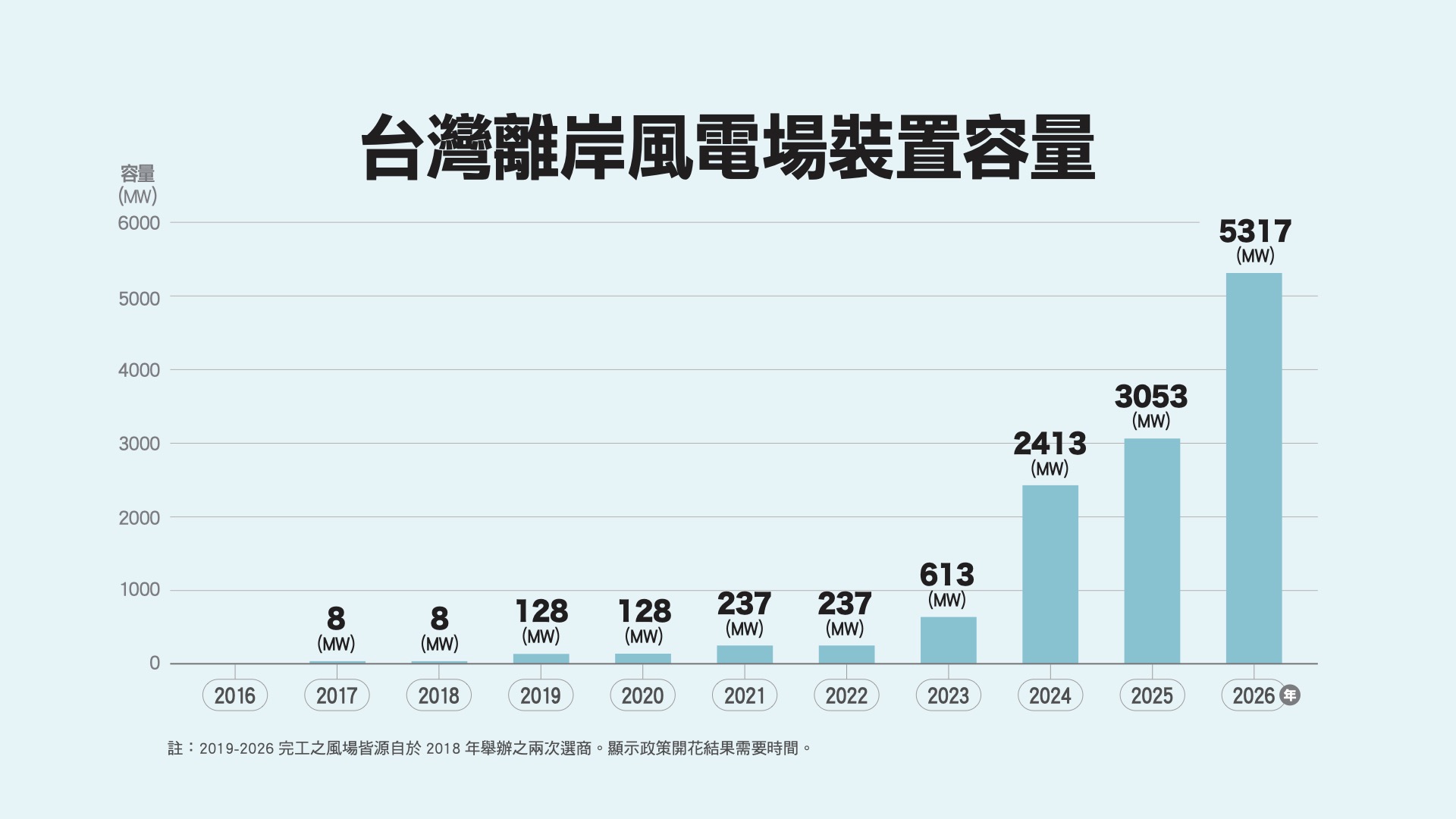 從2019年第一個示範風場完工,到2024年底,台灣的離岸風電裝機容量累積超過3GW,排名全球第五,並逐漸成為半導體護國群山的綠電供應來源。