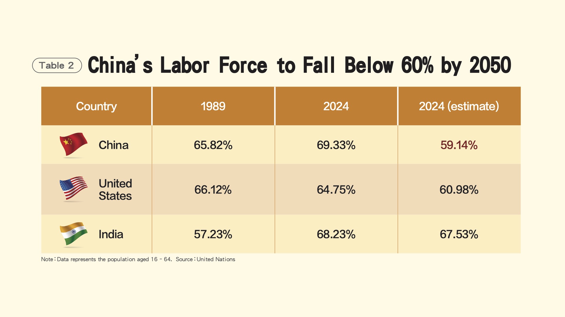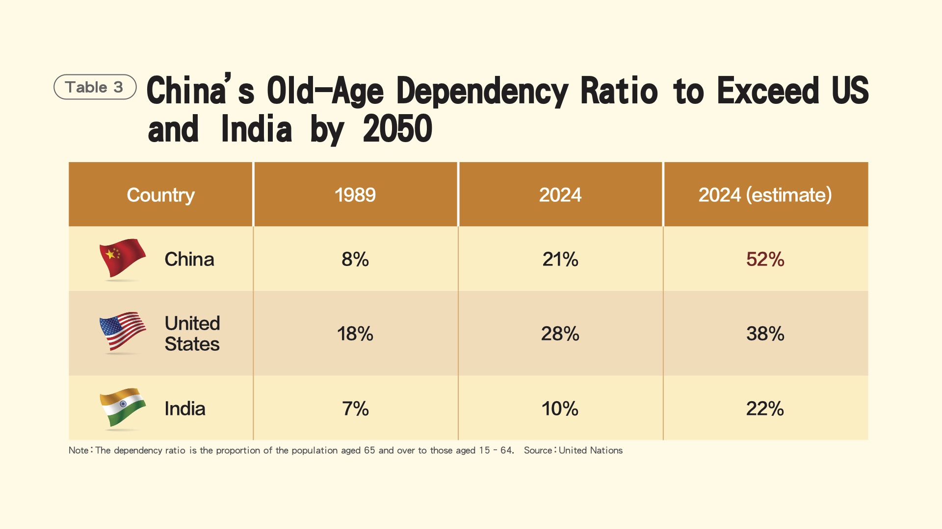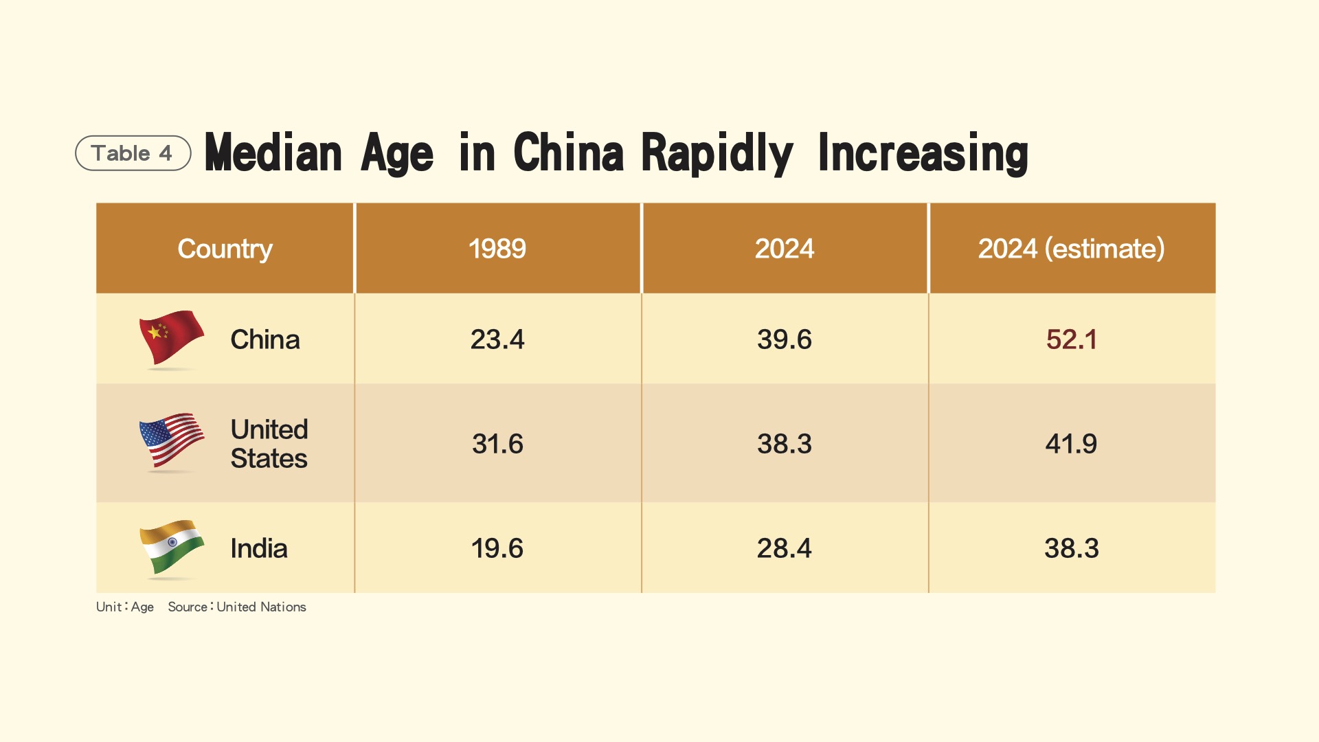 Population aging not only affects the economic dimension but may also impact social innovation vitality and political transition. Table 4 lists the population median ages for China, the United States, and India. A lower median age indicates a younger, more dynamic society. In 1989, China's society was predominantly young. As the population median age continues to rise (projected to increase from 39.6 years in 2024 to 52.1 yearsin 2050), the conservatism of society may strengthen, while the vitality of innovation and entrepreneurship may decline.