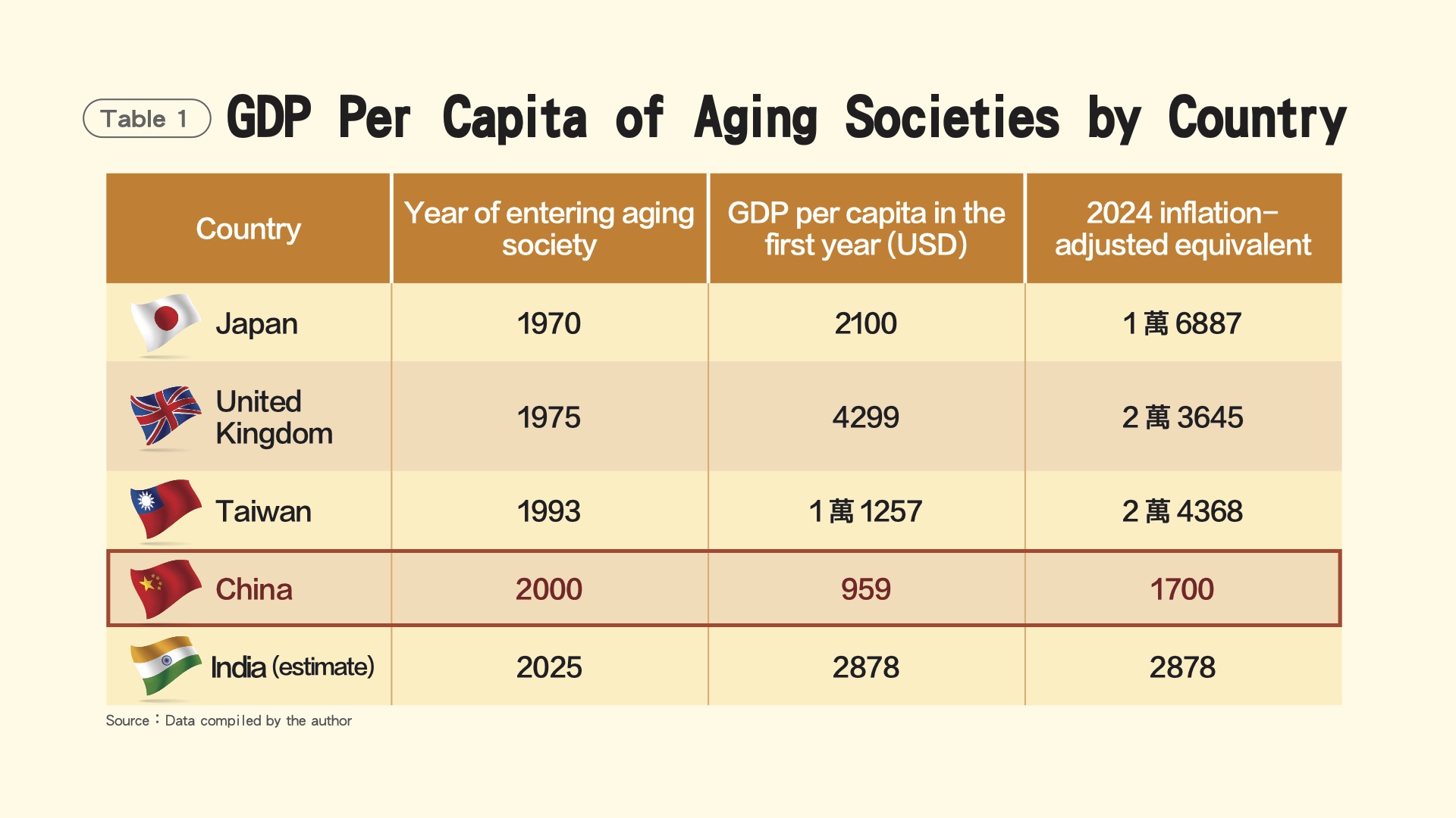 More crucially, when other developed countries entered an aging society, their per capita GDP had already reached a considerable level. For example, when Japan entered an aging society in 1970, its per capita GDP was $2,100 (equivalent to $16,887 in 2024). When Taiwan entered an aging society in 1993, its per capita GDP was $11,257 (equivalent to $24,368 in 2024). In contrast, when China entered an aging society in 2000, its per capita GDP was only $959 (equivalent to $1,700 in 2024). This situation of "getting  old before getting rich," where the country enters an aging society before its economy is fully developed and national wealth is sufficiently accumulated, will bring hidden worries for China's national power.