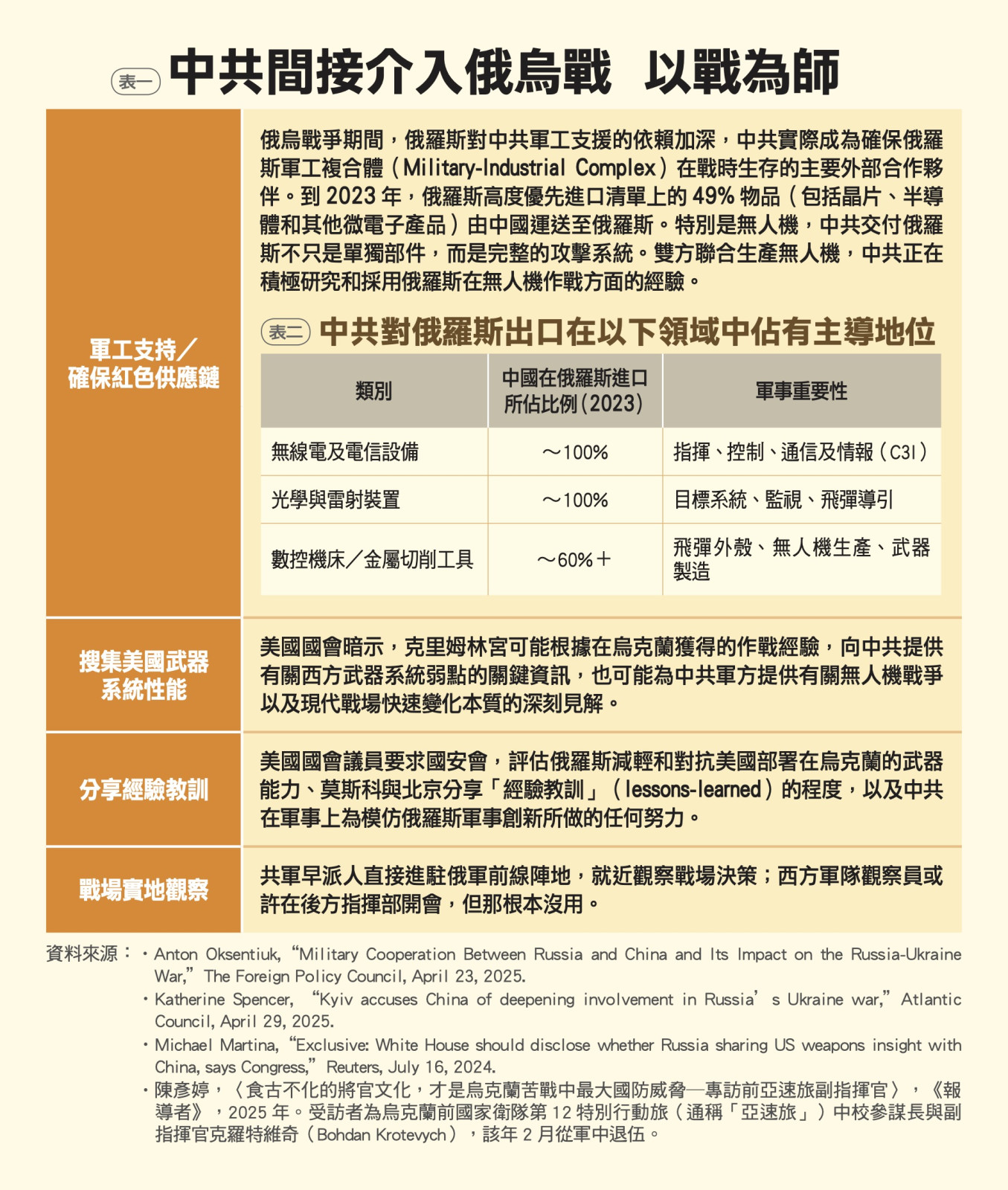 此外,中共以間接方式參與俄烏戰爭,在確保紅色供應鏈、搜集美國武器系統性能,以及與俄羅斯分享實戰經驗教訓等方面都有其深刻體驗(見表1),為今後對台和對美的軍事鬥爭準備帶來助益。