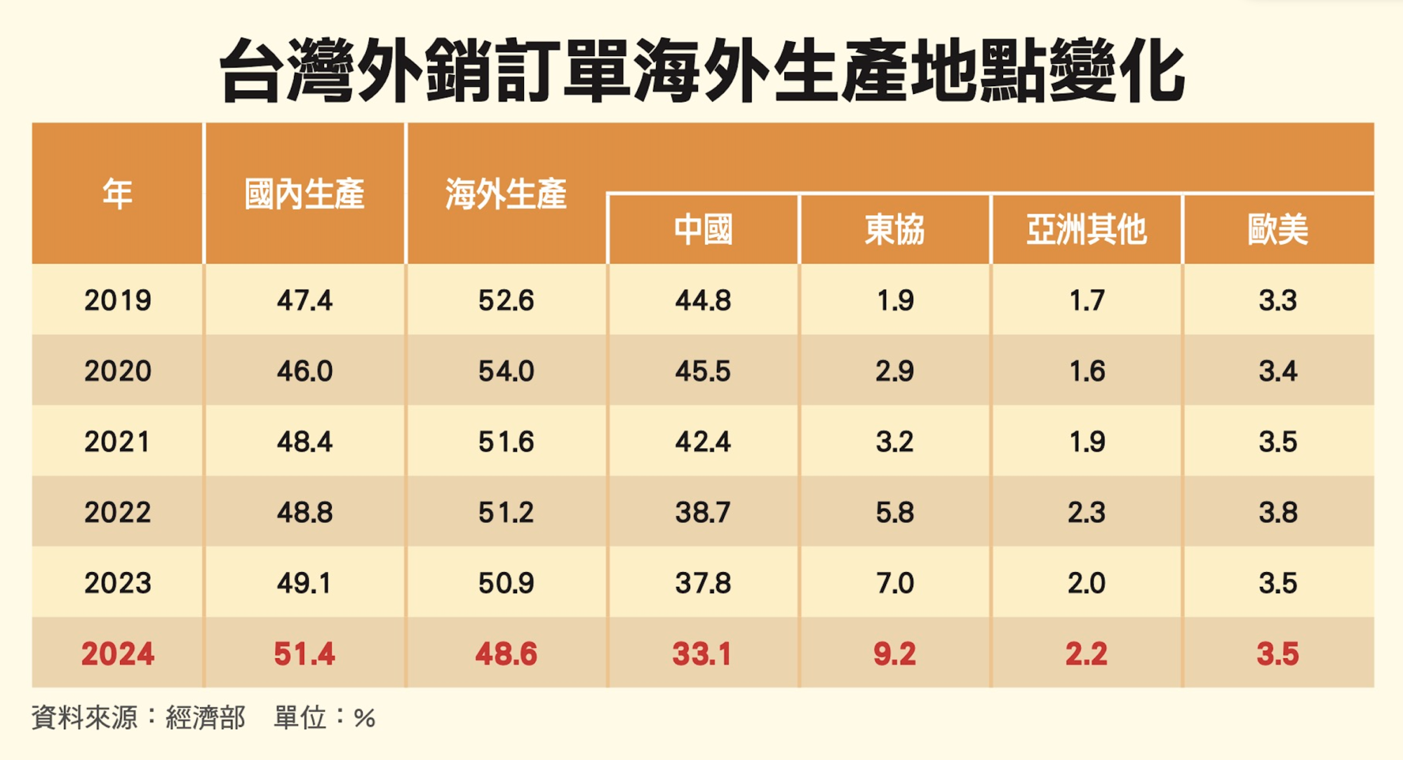 經濟部自2010年開始系統性的針對台灣接單、海外生產情況進行年度調查。從過去十年的資料來看,外銷訂單在台灣生產的比重,從2014年的46%逐步增加到2024年的51%,雖可看出近年台商回流的成效,但並未改變訂單「一半台灣、一半海外」的台灣模式結構。