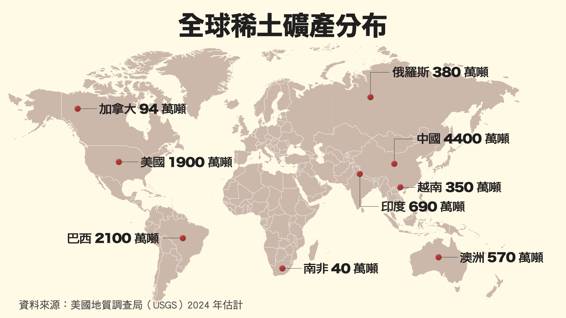 如果攤開全世界的稀土礦分布圖(如下),可以看到全世界幾乎各地都有,中國最多,達4400萬噸,美國1900萬噸、澳大利亞570萬噸,印度、巴西也都有。