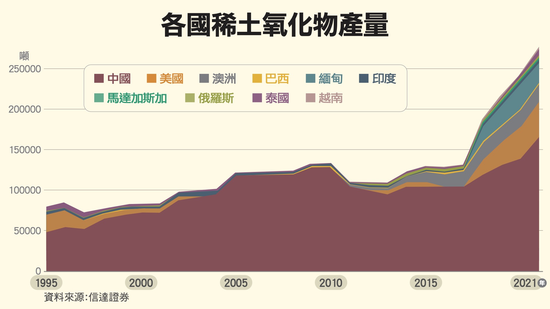 從下圖可以看到,2010年之前中國稀土產量幾乎接近壟斷全球的狀況,但在之後陸續出現其他國家增產,起因是2010年中國與日本的釣魚台紛爭,用禁止稀土出口來制裁日本,這讓許多國家警覺,例如美國就在當年推進了稀土自主的法案。
