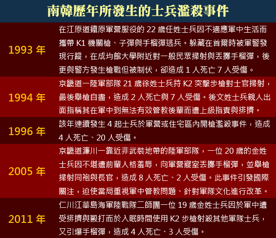 但是,在講究階級與尊卑觀念的韓國社會,軍隊的排擠與虐待問題儼然是構築於原先既有文化所存在的上下層次序關係與強調集體主義的加乘。南韓社會的這些基本傳統未能破除,則軍中施虐及導致士兵失控濫殺的情況將難以獲得解決。另外,如何改善軍方封閉的行事態度並增加透明度,則是台韓兩國都亟需面對的課題。