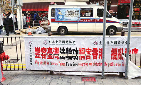 這是一幅香港的照片,一幅針對法輪功的橫額: