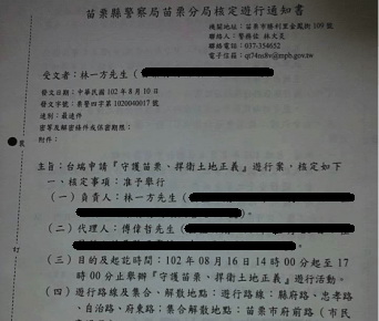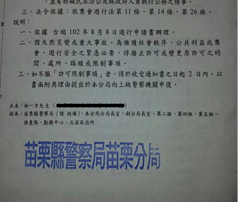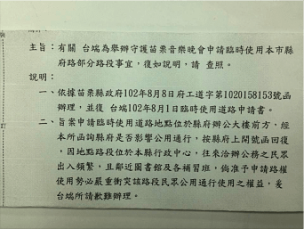 因此,我們在地方上舉辦「苗栗人民抗暴行動論壇」時,所到之處,不是地方警局電話頻頻關心,就是警察直接派人站崗、盯哨。而當我們打算申請八月十六日苗栗縣政府廣場前舉辦「拆政府、守護苗栗音樂會」時,明明是向苗栗市公所申請路權,苗栗市公所卻要向苗栗縣政府請示,而縣府居然以一個荒謬的理由回函,市公所就索性按照這個荒謬的理由,駁回了我們的路權申請。而當我們向市警局提出集會遊行申請時,市警局明知到我們的活動是晚上六點開始,居然只核准到傍晚五點,分明是刻意刁難,限制人民的集會遊行自由。