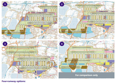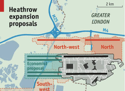 倫敦政經學院(LSE)的Tim Leunig對擴建案則提出另一個想法,就是在現有的跑道的正西方,直接擴建四條跑道(見圖二)。這個提案的噪音跟空汙受害範圍都比向北擴建小,運量也可以增加。這個計劃也有些其難度,不過擁有保守黨及自民黨智庫背書,經濟學人雜誌近期也發文支持此案。
