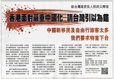 在台灣刊登的這份名為「給台灣政府和人民的一封公開信」,以家醜不怕外揚的心情,痛陳香港在中港融合下的慘況。內容宛如以自身為鑑,剴切地提醒台灣人民,勿蹈香港之覆轍,並提醒中台經濟融合的可能災難。此種自曝家醜的貶低,若曾經驗過港人過往那份「東方之珠」的驕傲感者,絕對會產生絲絲的違和感。