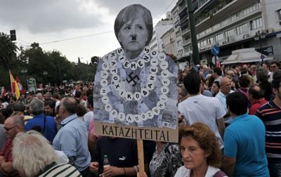 對外方面,在歐債風暴中立場堅定的梅克爾,認為要解決歐債問題,只有透過不留情面的撙節、將歐盟國家的財政體質做全面性的改革,才能使得歐元區再度擁有競爭力。這些強硬的談話也是她為何被部份希臘人視為希特勒再世的原因。