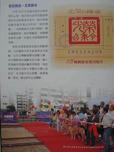 13號碼頭,易名為光榮碼頭,此乃因2006年10月,高雄市政府為了慶祝取回這軍方盤據50多年的13號碼頭,便舉辦了一場協力推倒封鎖高雄港50年的「柏林圍牆」活動,象徵性地把13號碼頭的蛇龍圍牆拉倒,並根據過往「金馬獎」的歷史,重新命名為「光榮碼頭」。而所謂「金馬獎」,則是指此碼頭乃是當年抽中金門與馬祖外島數饅頭的籤王兵種的前哨站。