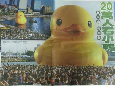據說,此一和平與愛象徵的小鴨,隸屬療傷系,能透由勾起兒時回憶,掃除不快樂的陰霾以治癒人們的不開心屬實的話,那小鴨越夯,是否也就意味台灣社會不斷飆高的痛苦指數哩?!個人對此鴨,實無好惡,但看國人對黃色塑膠鴨如此有感,卻對小鴨停泊的13號碼頭無感,倒頗令人神傷。