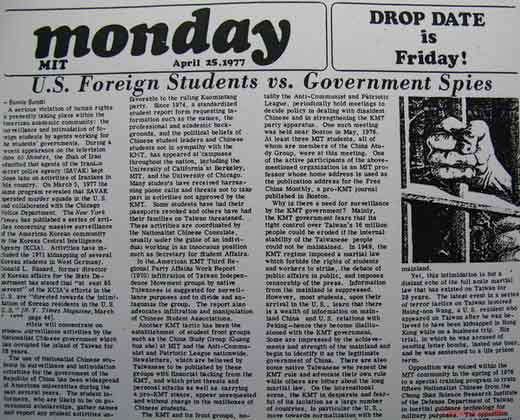 這篇報導也具體提到只要有台灣留學生在美國的活動不是國民黨所許可的,學生就會收到來自國民黨學生的恐嚇或警告電話。我們以1978年1月28日波士頓遊行為例,當時領導遊行的哈佛學生陳重信、張啟典也收到國民黨學生的警告電話,結果遊行當日是馬英九到現場拍照。