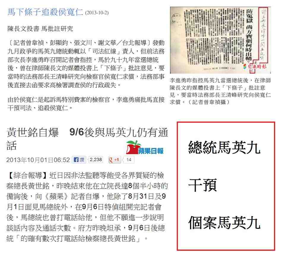 另一件今天報紙刊出的「馬英九眉批投書」也一樣。前法務部次長李進勇昨天召開記者會說,馬於2010年曾於律師陳長文在聯合報的投書上批註意見,要當時的法務部長王清峰研究向偵辦太極門案的檢察官侯寬仁求償,法務部事後直接去函要求高檢署調查侯有無行政疏失。總統府出來回應說,只是「請首長參考學者意見」,問題是侯寬仁是誰?侯寬仁不是台灣千百個檢察官裡的路人甲乙啊,他就是當年起訴你馬英九特別費案的檢察官。