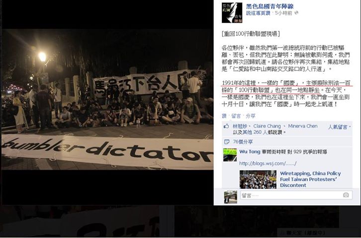 原本將在今天(10月9日)與明天上街頭抗議的學生團體「黑色島國青年陣線」,已經在今天凌晨突襲凱道,幾十名學生在那裡席地而坐,幾個小時後雖然被警方驅離,但學生們隨即再度集結,改到景福門旁繼續靜坐。